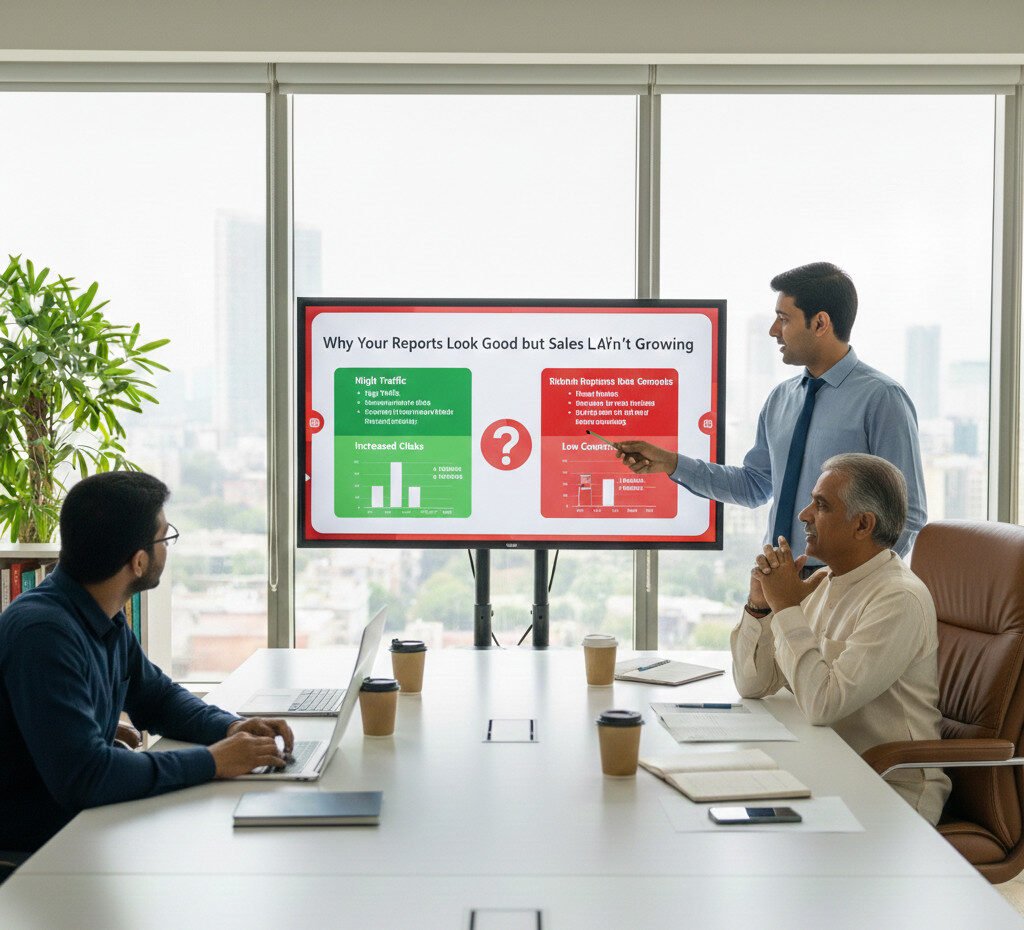 Sales aren’t growing even though your marketing reports look positive. Traffic is up, impressions are rising, ad dashboards show green arrows, and engagement numbers appear