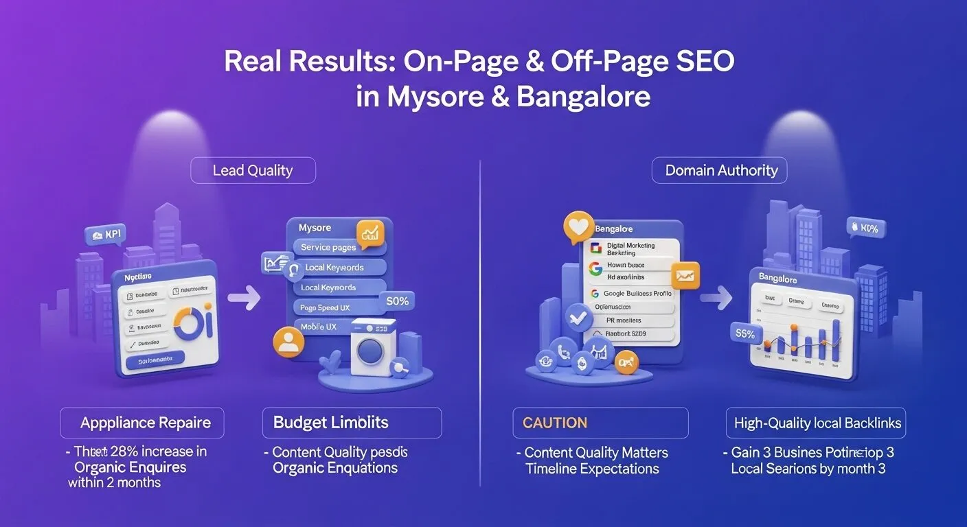 A Mysore and Bangalore-based appliance service company applied structured on-page SEO (optimized service pages, local keywords, faster mobile experience). Within two months, organic enquiries increased by 28%. By adding high-quality local backlinks and Google Business Profile optimization by month three, their website started appearing in the top 3 local search results for several key terms. For professional guidance, businesses can rely on SEO Services in Bangalore to achieve similar measurable results.